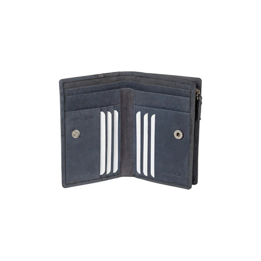 RB12175D | Zip Around Wallet in Genuine Full Grain Leather, Dollar Grain/Light. Color Blue. RFID Protection. Closed Dimensions: 11.5 x 10.5 x 2 cm. Packaging: Gift Box Bottom/Lid