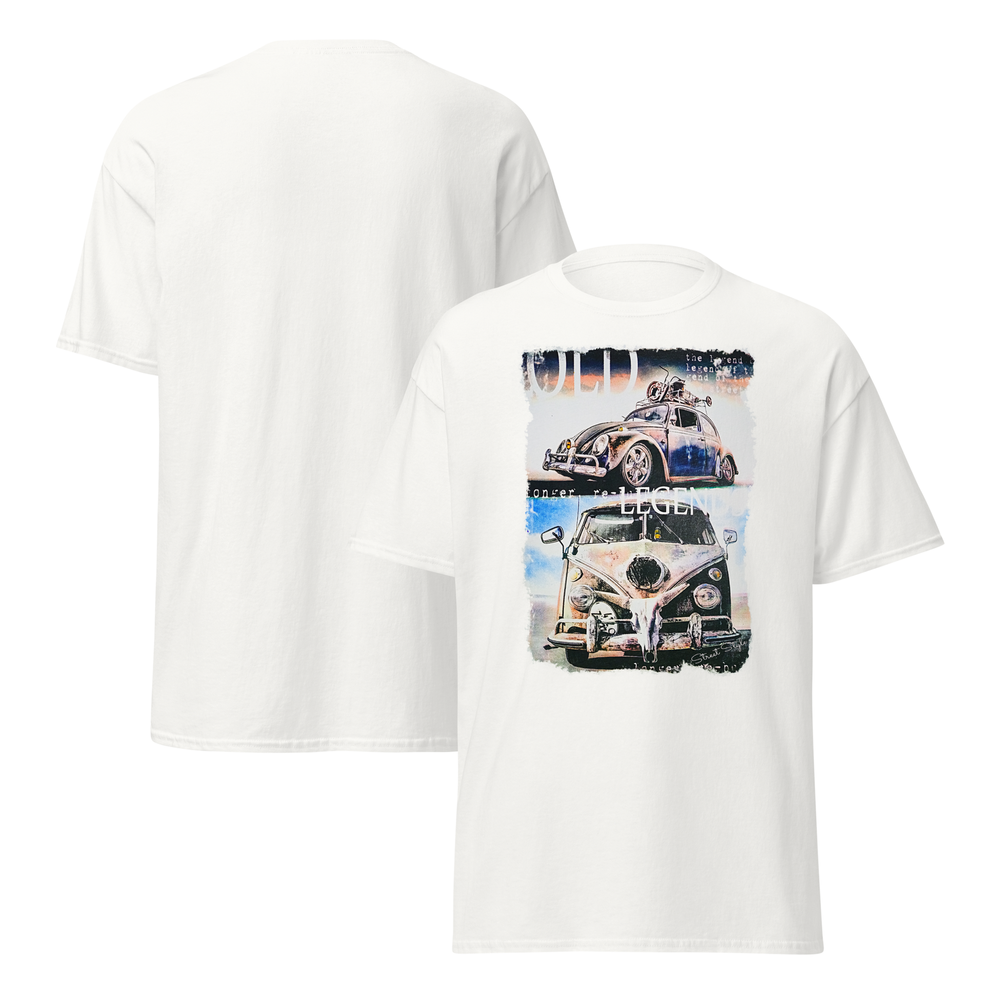 Esprimi la tua passione per le leggende della strada con questa T-shirt unica che celebra due icone: il Maggiolino e il Bulli Volkswagen. La stampa in stile vintage e distressed, con le scritte 'Wild' e 'Legend', aggiunge un tocco di carattere e spirito d'avventura al tuo look. Realizzata in morbido cotone di alta qualità, offre una vestibilità comoda e classica, perfetta per l'uso quotidiano o per i raduni di auto d'epoca. Un capo indispensabile per ogni appassionato di motori e stile retrò.