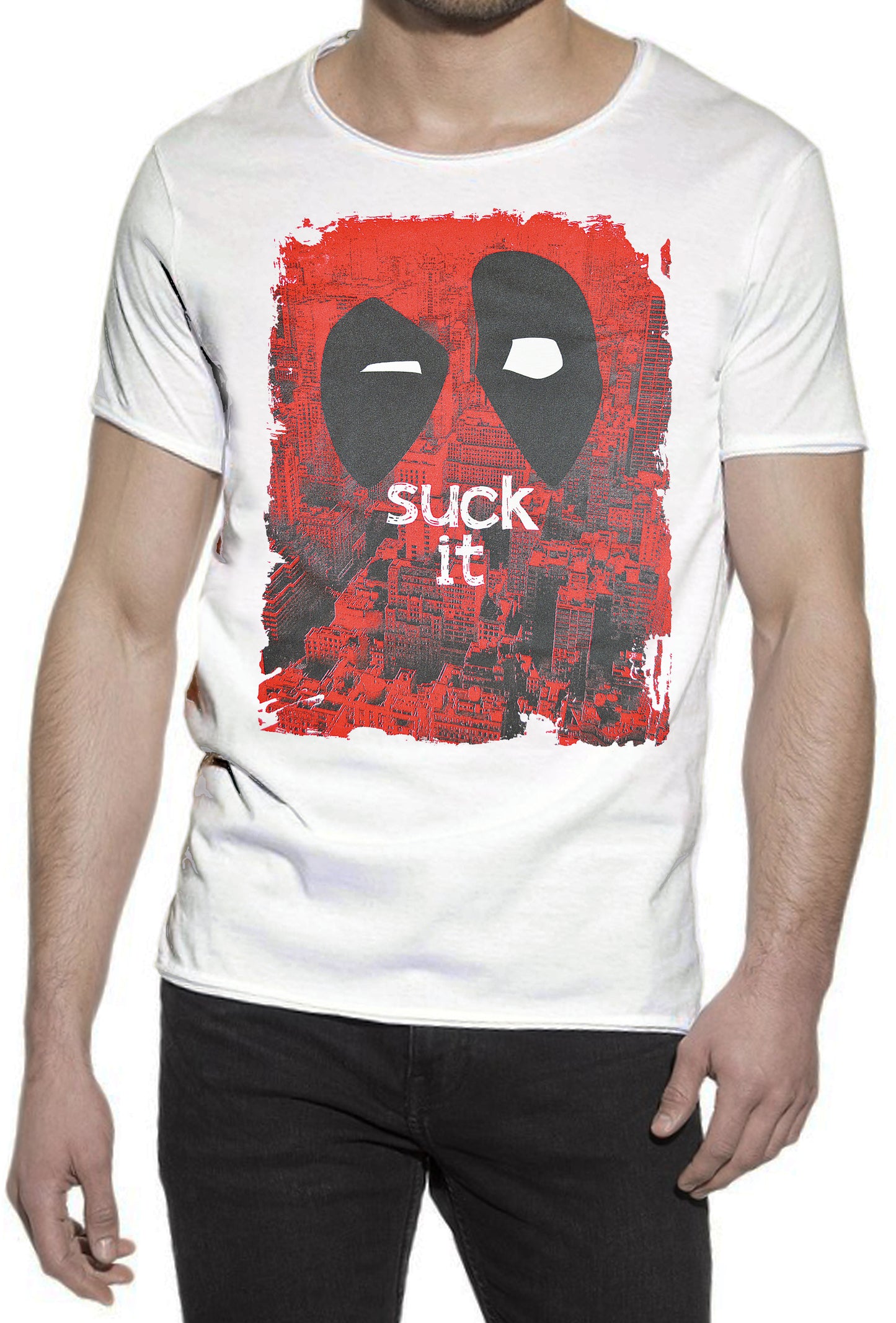 Share1.00Deapool Suck IT Film Cinema 2059-1 T-shirt Urban Slub Men Uomo 100% Cotone Fiammato JK