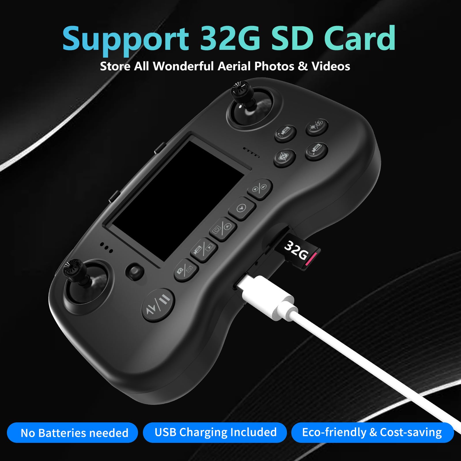 - 【Schermo LCD da 2,8 pollici + scheda di memoria da 32 GB】 Questo drone compatto è dotato di uno schermo LCD da 2,8 pollici che mostra chiaramente i dati di volo in tempo reale e le immagini della fotocamera senza bisogno di uno smartphone. Supporta schede di memoria fino a 32 GB, consentendo di archiviare facilmente grandi quantità di video e foto 4K, assicurando che ogni momento memorabile venga catturato.