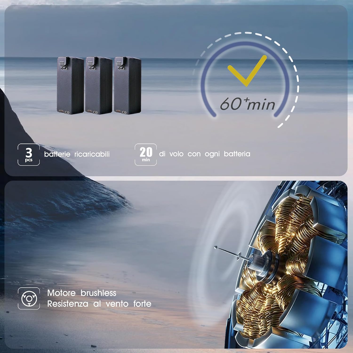 - 【Motori brushless resistenti & batterie potenziate】 I motori brushless in lega duratura resistono al vento forte, garantendo un volo più veloce, silenzioso e potente. Dotato di 3 batterie migliorate, può volare fino a 60 minuti, per un’esperienza di volo senza confini.
